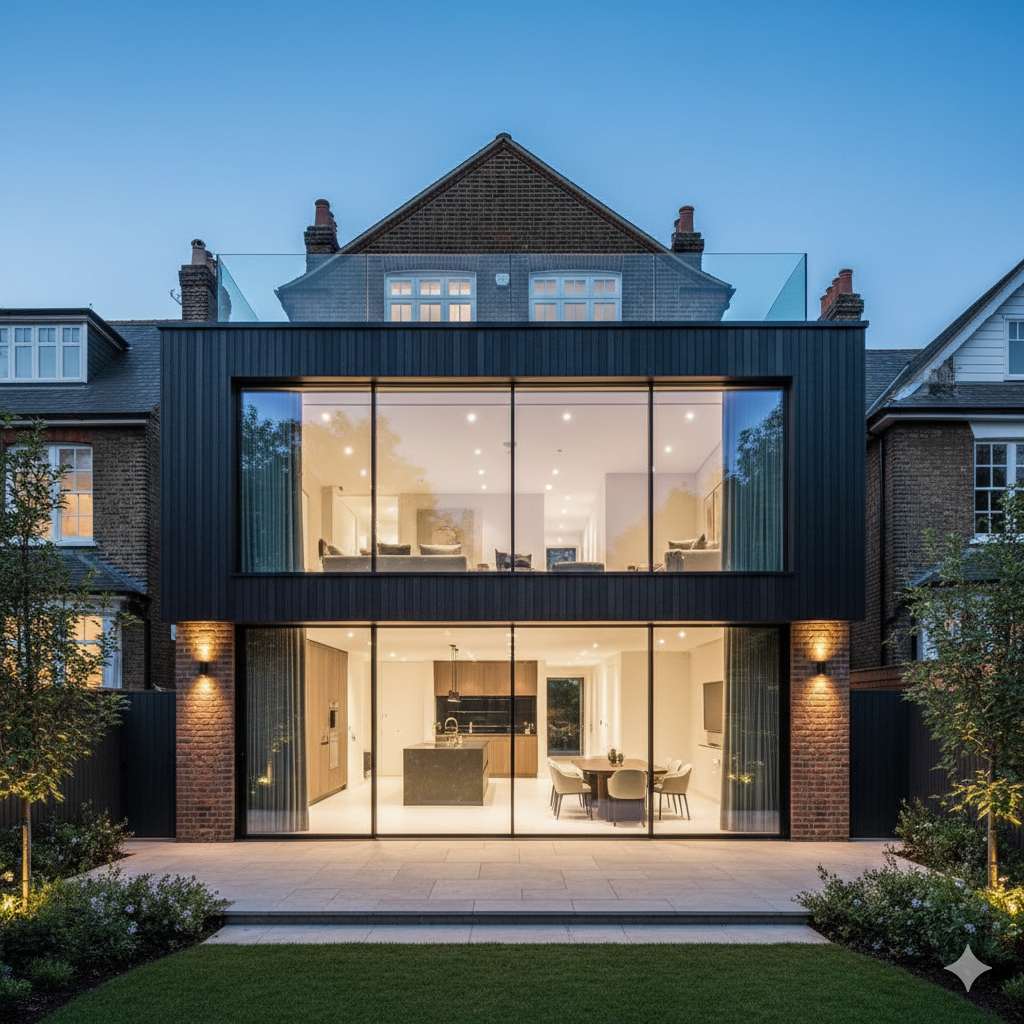 A luxury two-story extension with floor-to-ceiling windows and premium finishes.