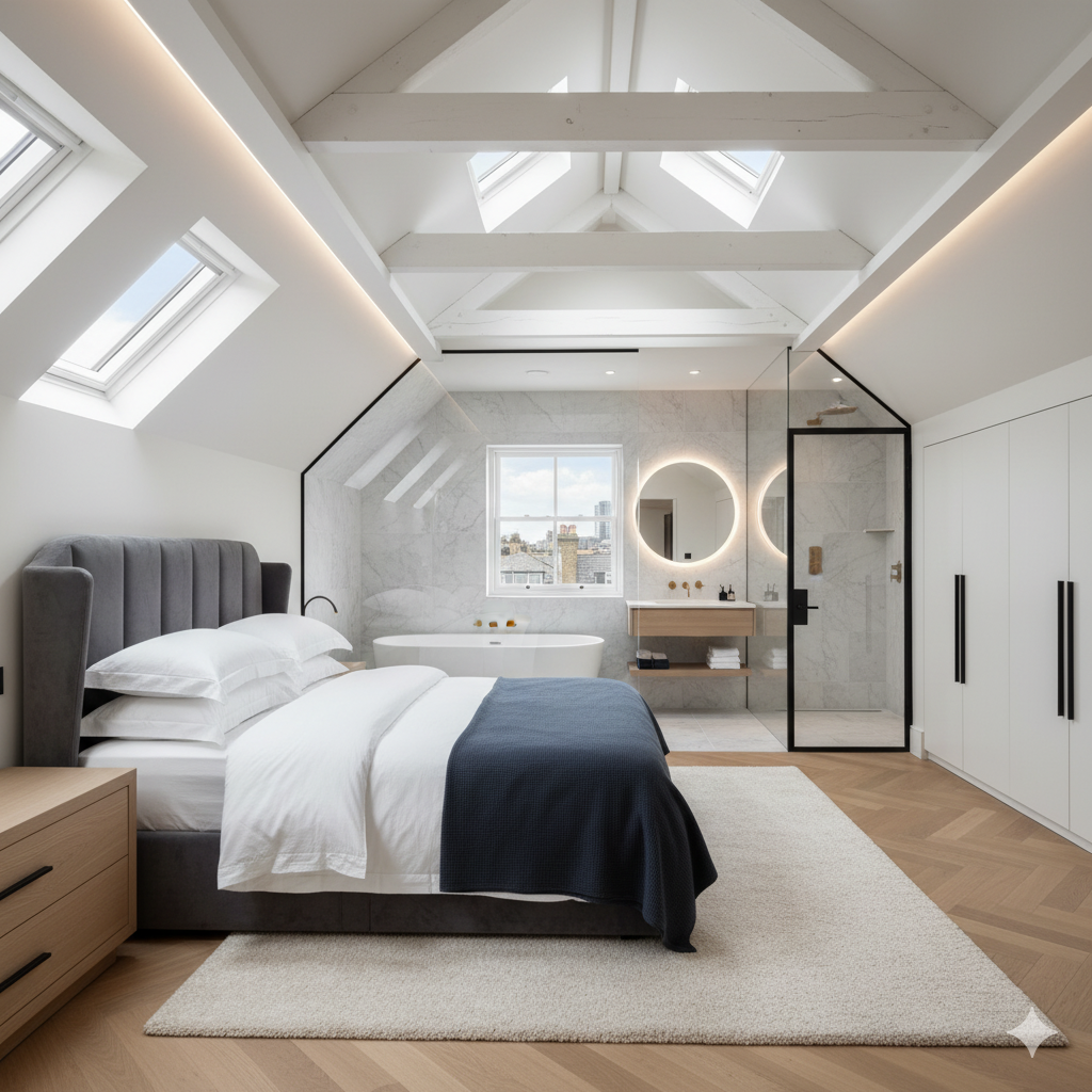 Transformation of an attic into a luxury master suite with ensuite bathroom.