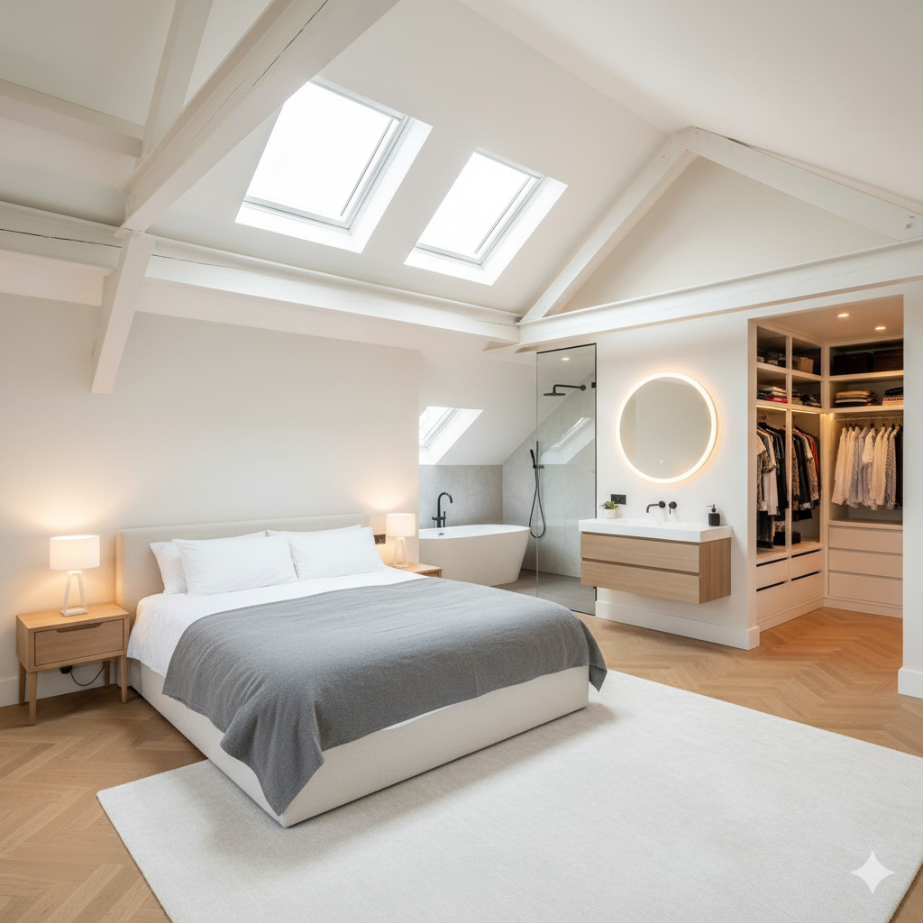 Converted attic space into a master-suite with en-suite bathroom and walk-in wardrobe. Added two Velux rooflights to maximise natural light, reinforced joists, upgraded insulation & carried out all planning and structural works. Completed in 8 weeks.
