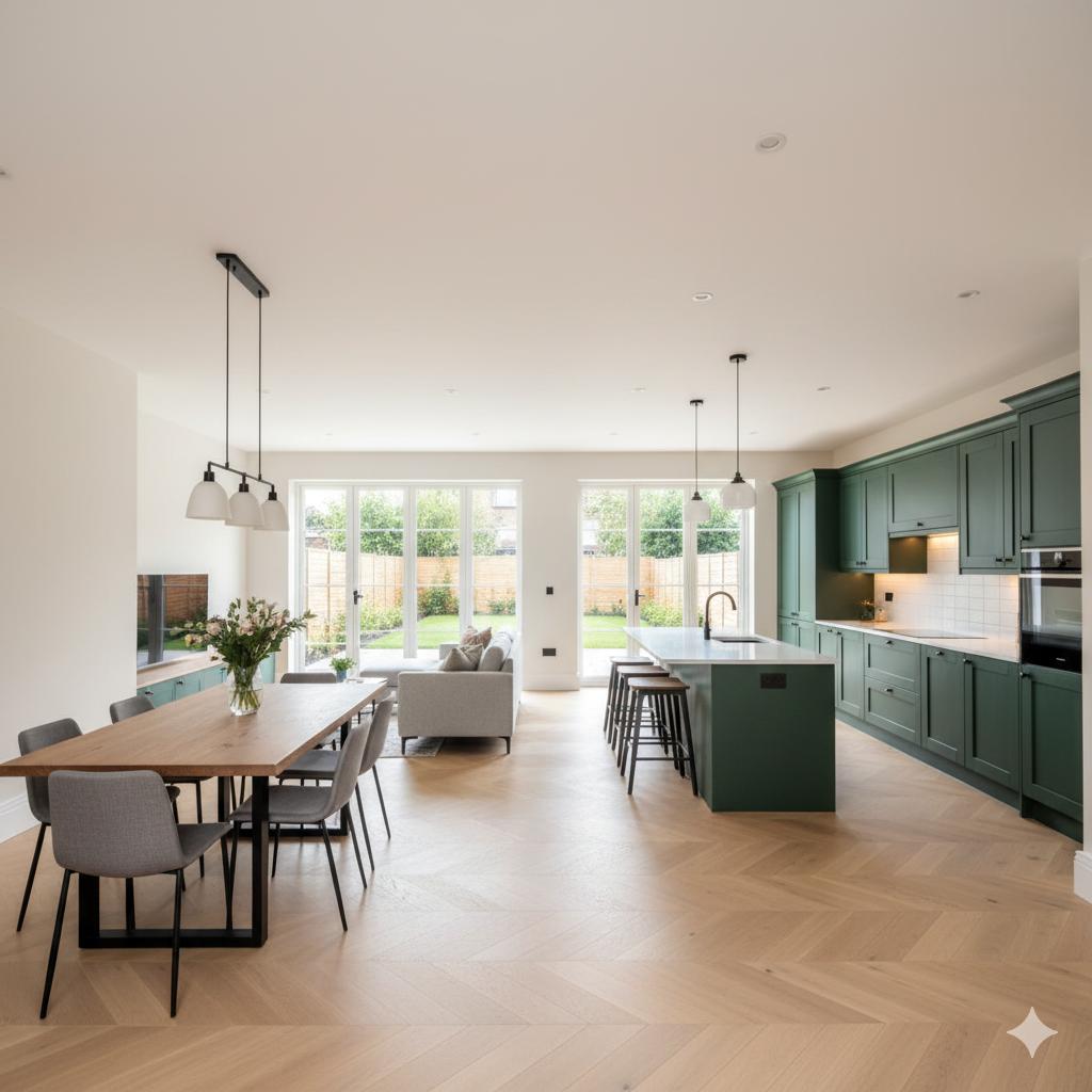 A whole-house refurb: stripped back interior, reconfigured downstairs layout to create open plan, new kitchen, three bathrooms refitted, new flooring, windows, and complete rewiring & plumbing upgrade. Delivered over 4 months.