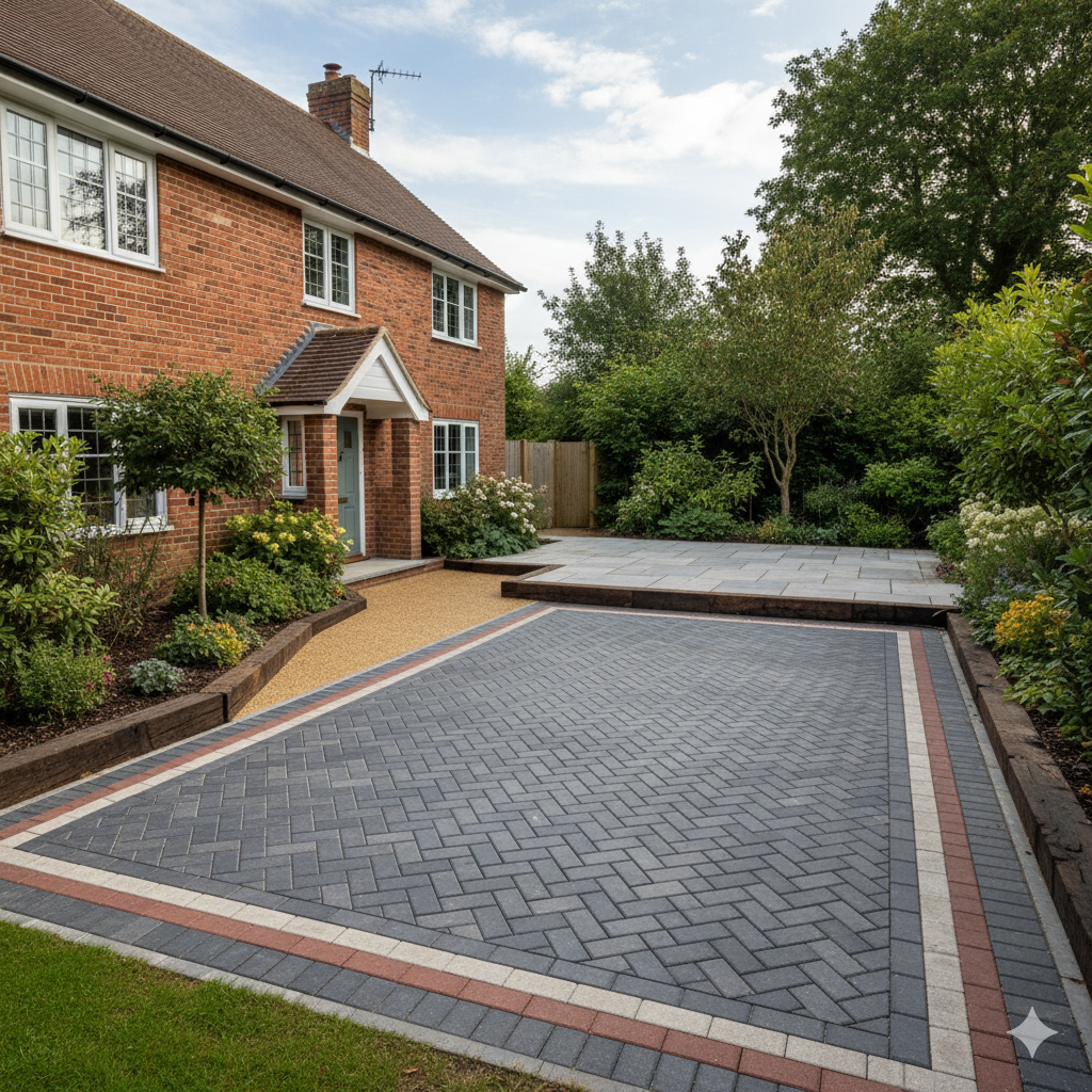 Installed block-paved driveway with decorative border, resin bound pathway, and a large natural stone patio with sleeper edging. All groundwork, drainage, and hard landscaping completed, giving the home an upgraded outdoor living space.